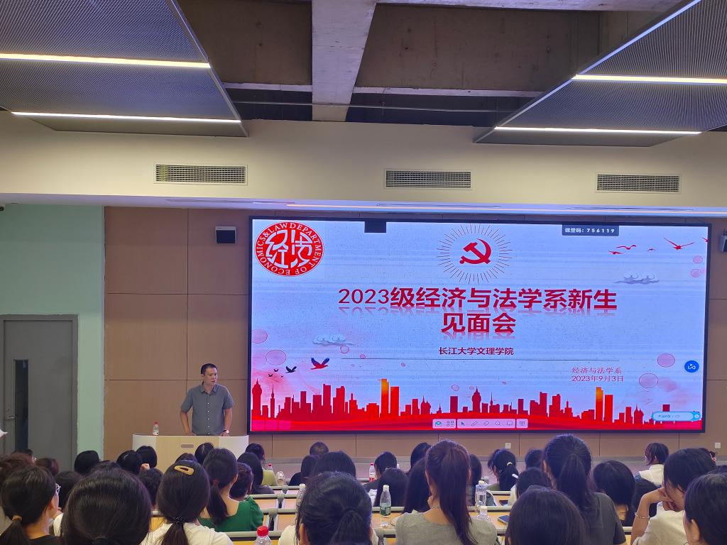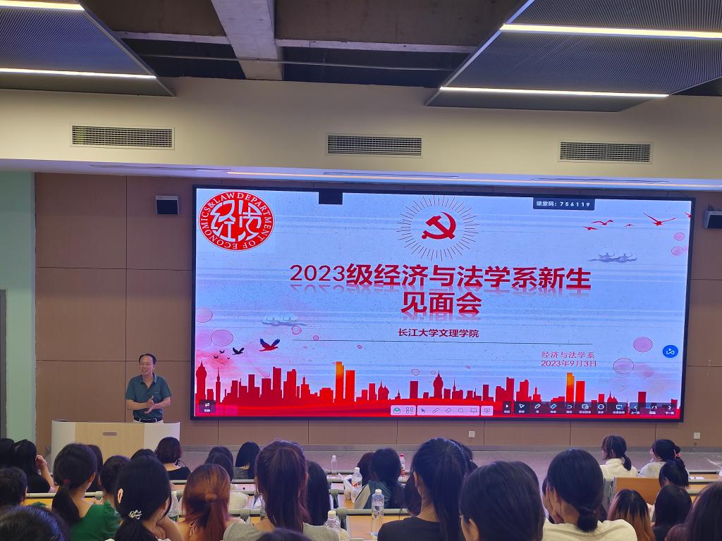 本网讯(见习记者:田琼钕)为进一步快速引导新生适应老员工活,营造积极向上的系部文化氛围,促进新生进行广泛学习交流,切实提高员工安全防范意识,保障新学入学后的人身财产安全。2023年9月3日晚上7点,经济与法学系在B-213和B-214召开2023级新生见面会。经济与法学系系主任万楚军、党总支书记邹姜,常务副主任罗明、副主任周密、党总支副书记杨杉杉出席会议,各新生班辅导员、班主任以及2023级全体新生参加本次会议。本次会议由辅导员卢佳智、滕宋云主持。