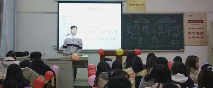 其中,法学5191班从“什么是喜欢?什么是爱?”、“生活中的爱”、“ 爱是什么?”、“如何爱?”、“恋爱与博爱的关系”五方面开展此次心理班会。通过播放《泰坦尼克号》的电影剪辑,让同学们更好的了解什么是真正的爱。强调激情、亲密、承诺共同构成完美爱情。金融5171班则从“生命的价值”、“如何实现生命的价值”两方面对同学们进行生命观教育,强调同学们应当有明确的目标、有必胜的信念、有明确的行动和饱满的热情,这样才能实现自己的人生价值。金融5182班心理委员在班会最后说到:“生命诚可贵,自杀不可取。在遇到挫折时,我们应该笑看人生,以积极乐观的态度去面对,那么一切都会迎刃而解。”其他班级也通过PPT讲演和观看视频的方式对本次主题内容进行了学习。