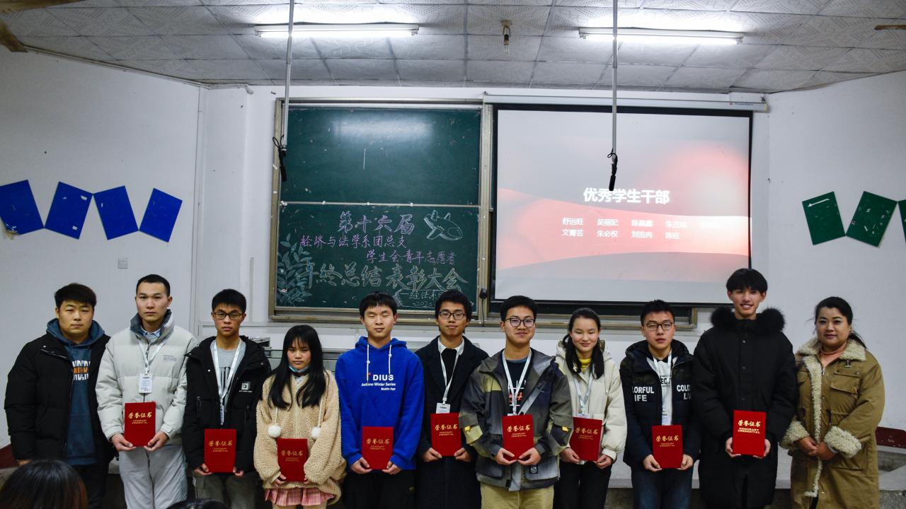 本网讯(通迅员 吴丽妃)为了回顾本年度团学工作的开展情况和取得的成效,增强团队凝聚力。经法系团总支于12月23日晚,在四教200举办了“第十六届经法系团学工作年终总结表彰大会”。本次会议邀请到了经法系党总支副书记杨杉杉老师和团总支员工会指导老师卢佳智老师出席,会议由秘书长谭舒文主持。