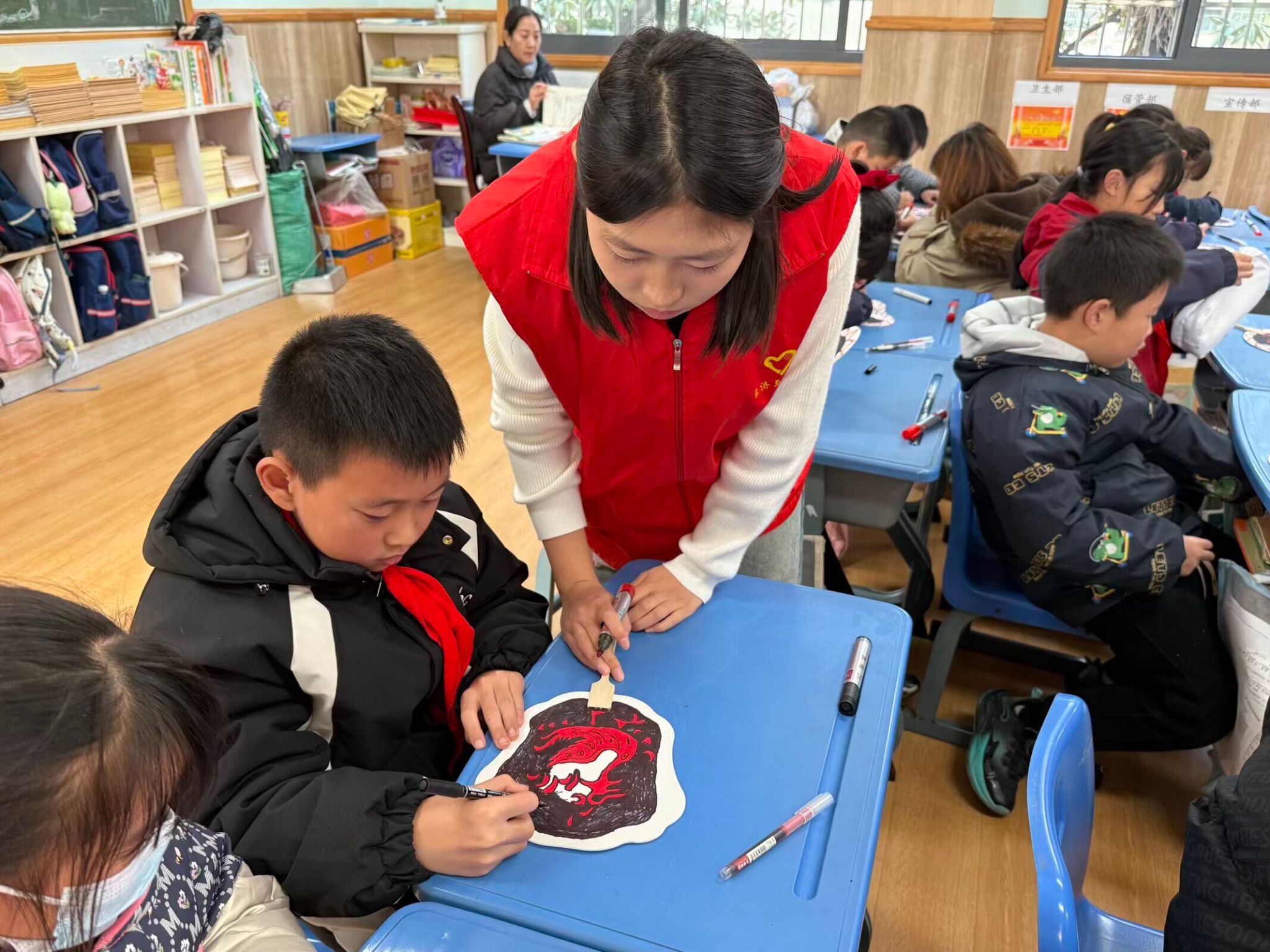 活动核心环节为“楚扇绘制”非遗文化体验课程。在该环节中,经法系志愿者积极发挥组织与引导作用,不仅为孩子们讲解了楚扇的文化内涵,还耐心指导他们调色、勾勒,完成属于自己的扇面作品。志愿者们注重鼓励与启发,让孩子们在动手实践中深入领略非遗之美。课程期间,杨杉杉来到孩子们中间,亲切观摩创作过程,并给予现场指导。