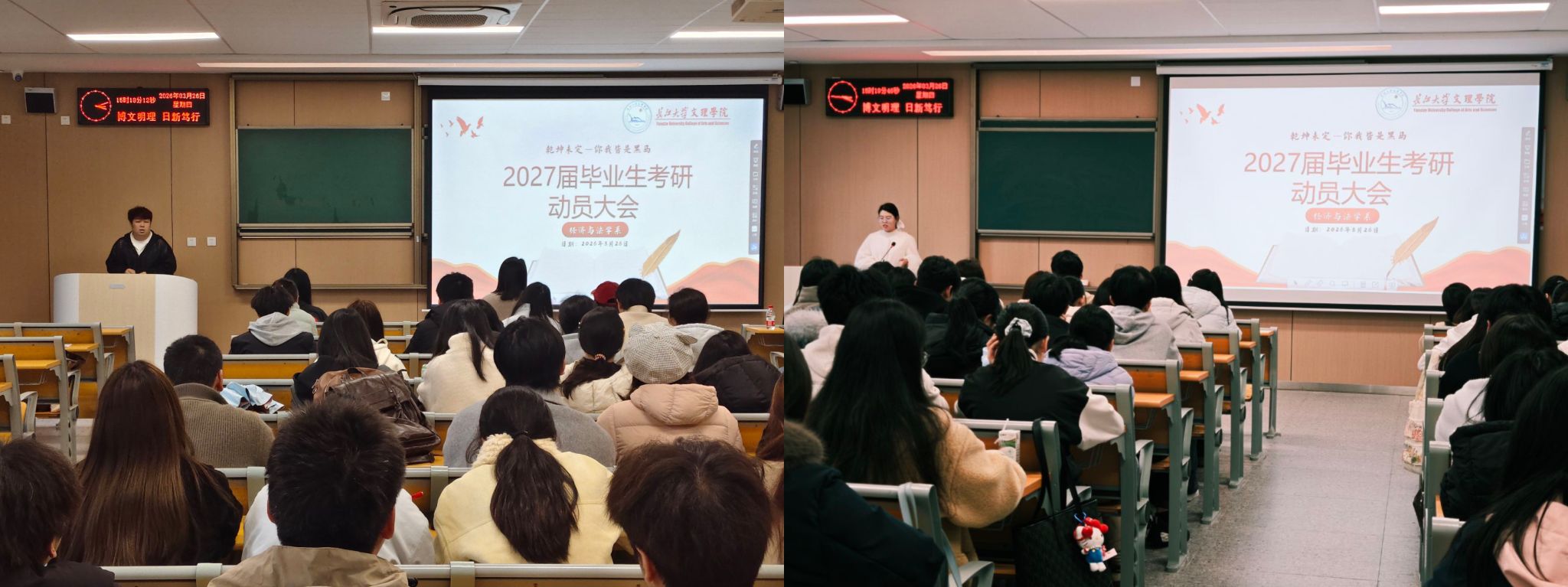 本网讯(见习记者:谭钱鑫)为促进经法系员工高质量充分就业,贯彻落实公司“两康一训”育人理念,3月26日下午,经法系在C-217、C-219教室隆重召开2027届毕业生考研动员大会。系领导班子成员,23级班主任出席动员大会。会议由辅导员卢佳智、刘曼莹分别主持。