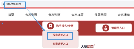 1)请务必在浏览器输入大赛官网网址ucc.fltrp.com(不可百度模糊搜索),在首页点击“选手报名/参赛”—“校赛选手入口”进行登录。