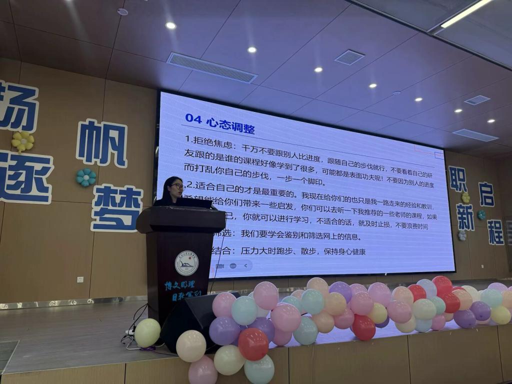 5月20日下午,优秀毕业生代表,员工党员叶清清及优秀毕业生刘丹两位同学,为22级全体同学分享了在校期间的学习成长经历与感悟,表达了她们对党组织培养的感激之情及未来继续发挥党员先锋模范作用的坚定信念,引发全场共鸣。叶清清回首了自己考研之路,表示那是一段布满荆棘却又无比珍贵的旅程,尽管也曾迷茫和焦虑,但作为一名党员,她深知“功崇惟志,业广惟勤”,既然选择了考研这条道路,就必须坚定信念,勇往直前,希望同学们都能在考研的道路上勇往直前,收获属于自己的成功!