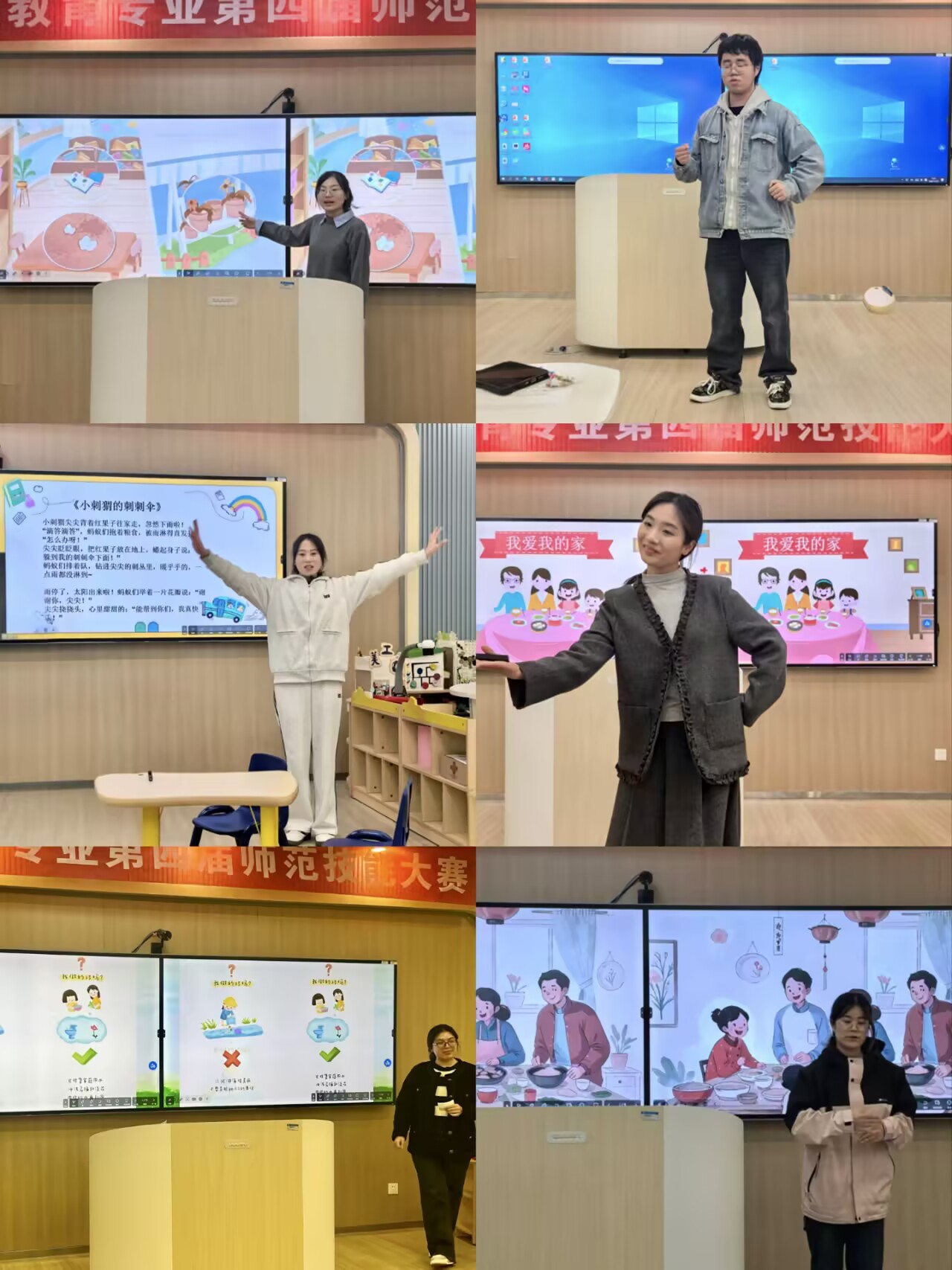 本届大赛紧密对接学前教育专业人才培养目标,赛程设计科学全面,包含“幼儿园教学活动设计”与“活动展示”两大核心环节。在教学设计环节,选手们依据抽签主题,在规定时间内精心构思、撰写完整的教学活动方案,并独立准备丰富的教学材料,充分考察了其理论功底与策划能力。随后的活动展示环节更是精彩纷呈,参赛选手模拟幼儿园教学场景,以亲切自然的教态、富有感染力的语言、巧妙的活动设计,将抽象的知识转化为生动有趣的课堂,淋漓尽致地展现了未来幼儿教师的专业素养与独特魅力。