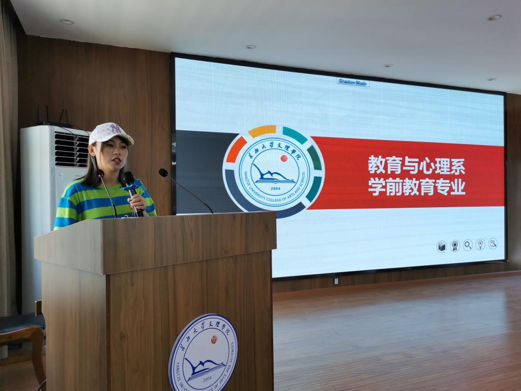教育与心理系主任徐霄介绍了学院概况和发展历史,教育心理系基本情况,并从团队力量,专业设置,人才培养,教学质量等方面进行了介绍。学前教育专业的鲁婷老师,从更加微观的层面介绍了学前教育专业,包括办学条件、课程设置、实践教学等与同学们进行了分享。通过大量的图片、视频,让同学们对将要面临的老员工活有了更直观的感受,对未来充满期待的同时信心满满,同学们表示将不断增加自身综合素质能力,自律自立,充实地度过老员工活。副书记梅曼曼做总结发言。