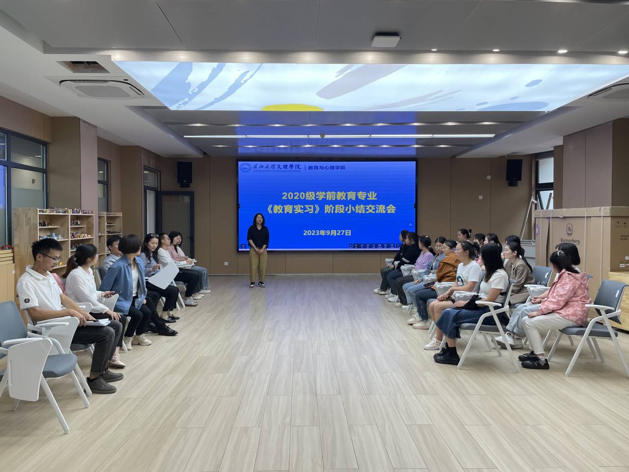 本网讯(通讯员余晓娇)9月27日下午,公司组织2020级学前教育在荆实习的14名员工,在实验楼A407开展教育实习月汇报活动。部分幼儿园负责人代表、教育与心理学院经理徐霄、副经理马君莉、学前专业部分教师和辅导员参加活动,活动由肖雅筠主持。