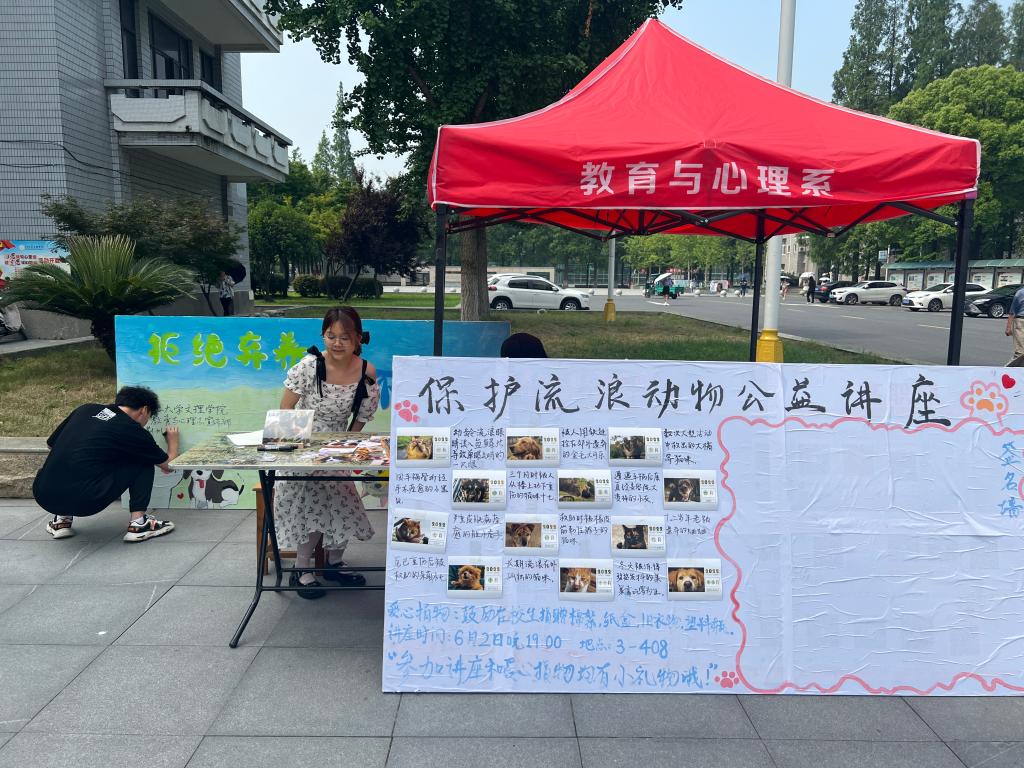 本网讯(员工通讯员 吴思齐)5月31日,由荆州市流浪小动物保护中心和我系团总支共同举办的为期4天的“关爱取代伤害 领养代替购买”爱心捐物活动在一号教学楼前展开。主题公益讲座于6月2日晚7点在2教203举行,荆州市流浪小动物保护中心负责人、教育与心理系老师及各院系师生参与此次活动。