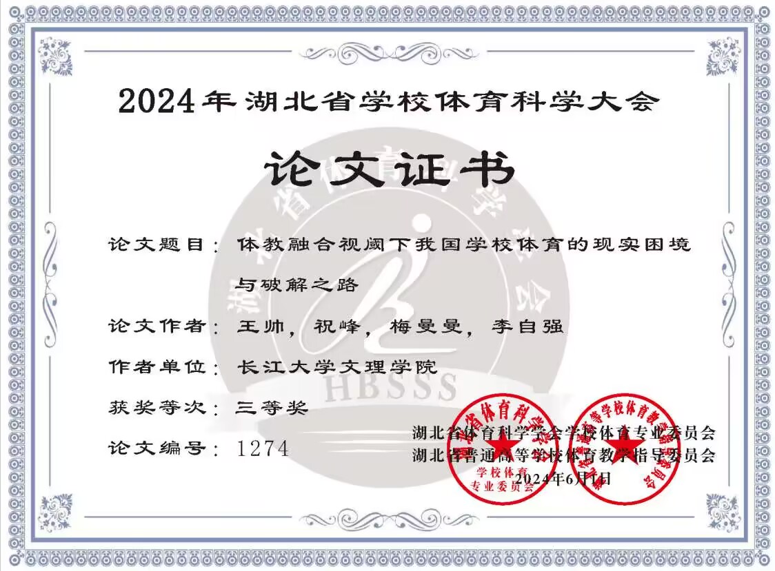 据悉,本次大会共收到来自全省各有关单位和个人报送的论文1741 篇,经论文学术不端系统检测、人工筛查和专家评审等程序,录取论文1082 篇,公司教育与心理学院教师王帅、祝峰、梅曼曼等人撰写的论文《体教融合视阈下我国学校体育的现实困境和破解之路》获三等奖。