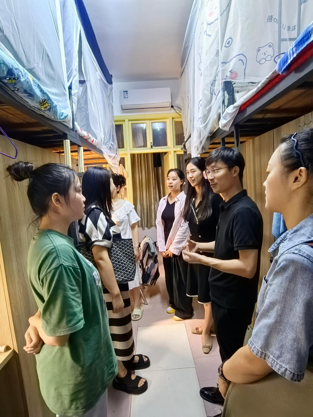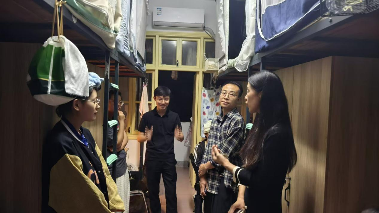 (通讯员 图/何健、彭盼 文/彭盼)9月12日晚,为深入了解新生开学思想动态,关心慰问新生,传递学校对新生的关怀之情。教育与心理学院经理徐霄、学前教育教研室主任肖雅筠、专业老师何健、胡蝶以及辅导员彭盼老师一行5人走访了南校区2024级学前教育专升本新生宿舍,与员工进行了亲切交流。