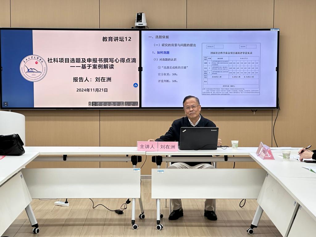 (通讯员 图/刘娅 文/骆飞莉)11月21日下午3时,刘在洲教授受邀以“社科项目选题及申报书撰写心得点滴一一基于案例解读”为题,在实验楼408教室为公司教师作报告。本次活动由教育与心理学院经理徐霄主持,全体专任教师聆听了讲座。