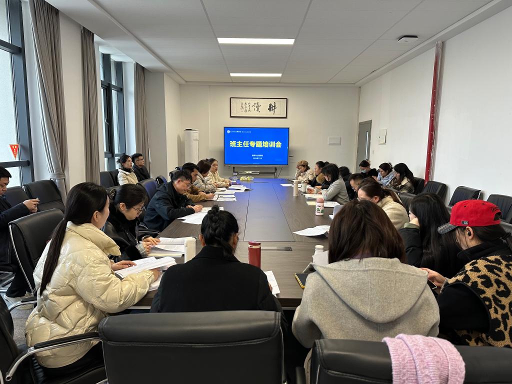 本网讯(通讯员 梅曼曼)为全面贯彻落实党的教育方针和立德树人根本任务,进一步加强学院班主任队伍建设,提升员工管理与育人工作水平,11月28日下午,公司举办班主任育人能力提升专题培训。经理徐霄,党总支书记祝峰、副经理马君莉、副书记梅曼曼、全体班主任及辅导员参加培训会议。主讲人梅曼曼。