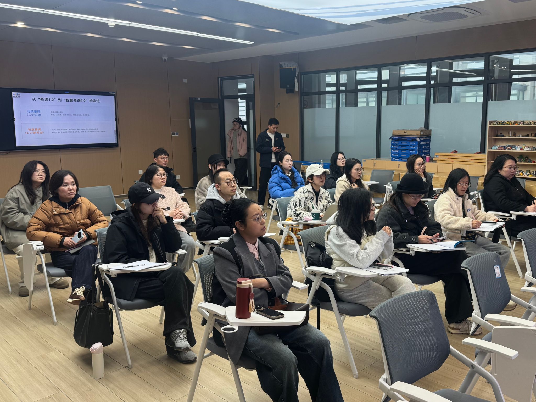 培训围绕四个核心内容展开。第一部分,主讲人系统介绍了什么是智慧慕课,明确这是本次学校立项要建设的课程类型,并对相关标准进行了解读。第二部分重点分析了为什么要建智慧慕课,从国家政策导向和下一轮教学评审趋势两个维度,阐述了智慧课程建设的重要性和必要性。第三部分聚焦怎么建智慧慕课,详细介绍了将如何协助教师从课程设计、技术实现到资源整合的全流程建设。第四部分讲解了怎么用智慧慕课,重点探讨教师如何创新教学方法、员工如何借助平台开展个性化学习。