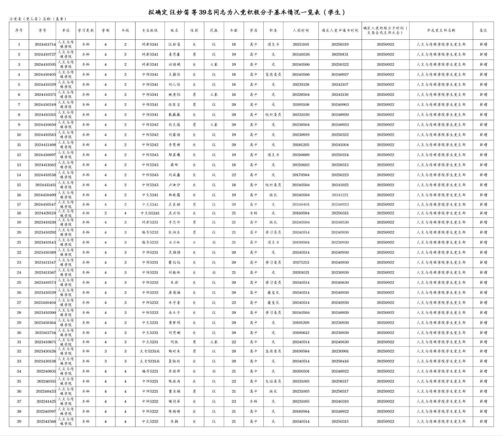 根据党员推荐和团组织推优情况,经支部委员会会议讨论决定并报分党委备案,确定汪妙迪等39名同学为入党积极分子,现予以公示。公示时间:2025年9月24日至2025年9月29日(公示时长一般为5个工作日)。