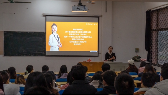 本次会议邀请了深圳市妙语国际文化传媒有限公司代表李兰兰,同时她也是人文与传媒学院的优秀员工,她通过短视频、PPT、室内互动等形式围绕就业现状、岗位需求、职业发展、行业经验、薪资待遇、企业文化等内容展开了详细全面的宣讲,耐心解答了同学们的疑惑,现场交流气氛热烈。李成军书记也分享了自己的从教生涯、工作经验,寄语学子们要努力学习,彰显青年本色。