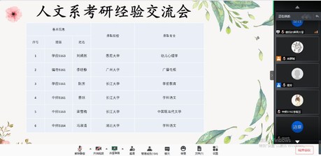 网讯(员工记者 黄琪雯)6月11日下午,人文系2020年考研经验交流会在线上举行。刘嫣然、季晗静、阮芳、蔡钰、梁雪梅、冯淑清6位考研成功同学向学弟学妹们分享了自己的经验,并对相关问题进行解答,本次活动由人文系党总支副书记周芳主持。