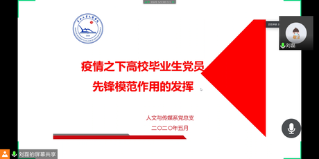 本网讯(员工记者 亢振伟)齐心抗疫情,携手并初心。2020年5月14日晚7点,人文系采取线上授课的形式,通过腾讯会议召开以“疫情之下高校毕业生党员先锋模范作用的发挥”为主题的毕业生党员专题党课。人文系党总支书记刘磊担任主讲人,人文系2020届全体毕业生党员线上聆听。