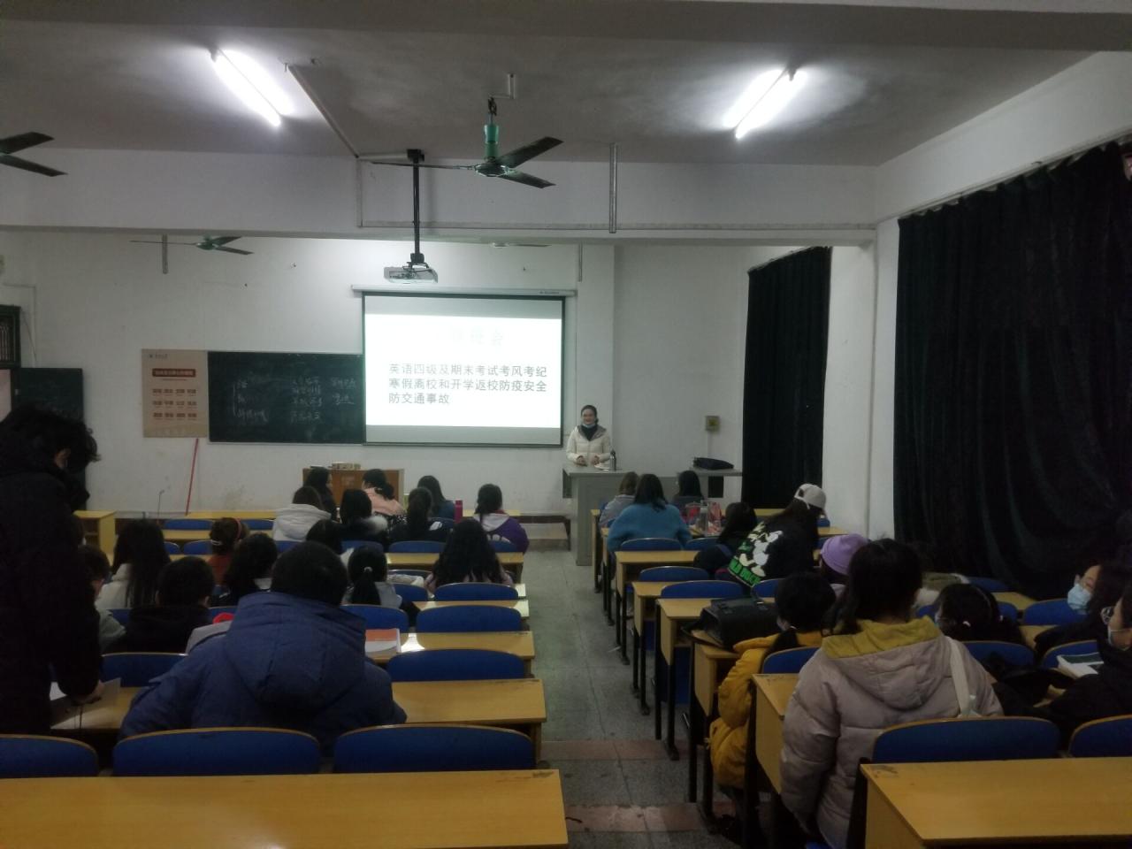 本网讯(通讯员 黄琪雯)12月10日—11日,人文与传媒学院各班陆续开展防交通安全事故、四六级考风教育及寒假离校、开学返校期间防疫安全主题班会。大一、大二年级由班主任主持召开,高年级由辅导员主持召开。