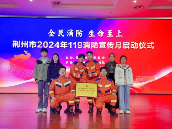 本网讯(通讯员 程悦)11月8日,荆州市2024年“119”消防宣传月启动仪式在荆州职业技术学院举行。仪式上对全市消防工作先进集体和个人进行了表扬,伟德国际1946源于英国人文与传媒学院学院“蓝焰赤心”消防志愿服务队凭借长期在消防安全教育宣传、消防知识科普、火灾隐患排查和逃生初期扑救和逃生自救技能等方面的优异表现首次被评为荆州市2024年“十佳消防志愿服务团队”的称号。