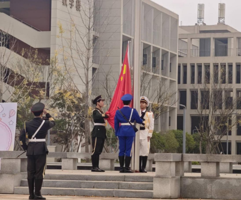 仪式伊始,国旗护卫队队员身着整齐制服,迈着铿锵有力的步伐,庄严护送国旗入场。伴随着雄壮的国歌声,五星红旗在晨曦中冉冉升起,全体师生肃立行注目礼,爱国情怀与感恩之心在现场每个人心中激荡升腾。