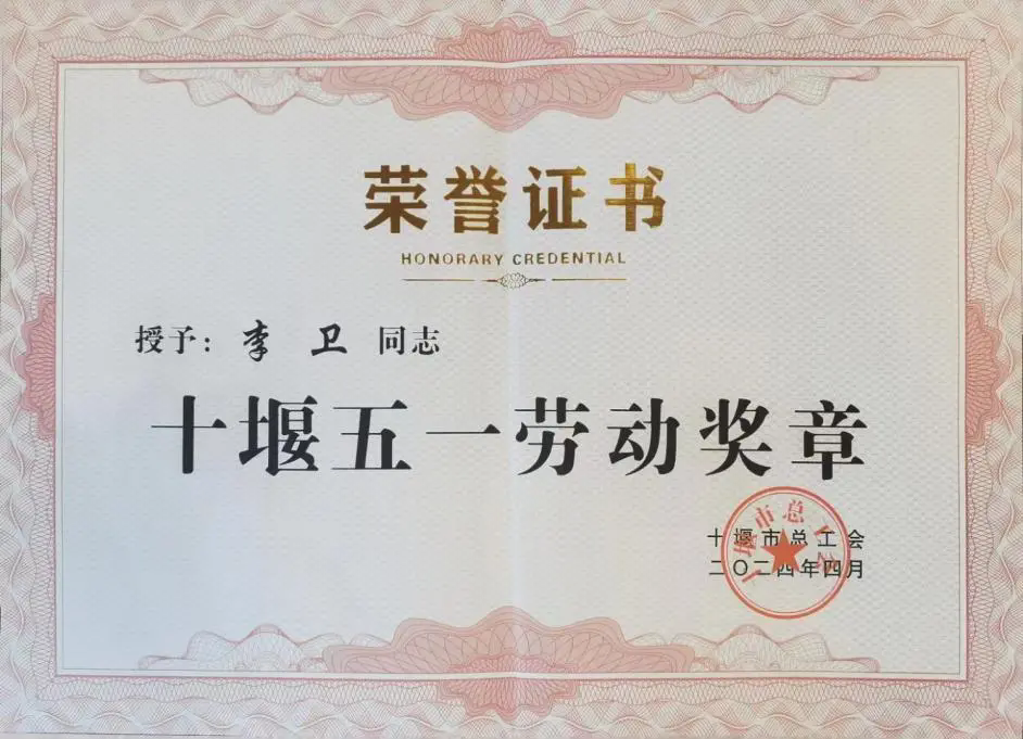 除了在教学教研上表现突出,李卫老师在育人管理和岗位贡献上也同样出色。因其卓越的工作表现和突出的贡献,他荣获了“十堰市五一劳动奖章”这一崇高荣誉。这既是对他辛勤付出、爱岗敬业的褒奖,也是对其在教育事业上全心投入、成就斐然的肯定。