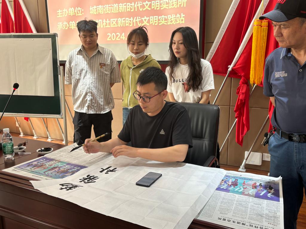 接着进入书法交流环节,公司书法老师简要讲述了书法的起源、演变及楷书的发展历程,活动现场,墨香四溢,教职工与社区党员们兴致勃勃地挥毫泼墨,笔走龙蛇。在轻松愉快的氛围中,大家交流心得,分享感悟。