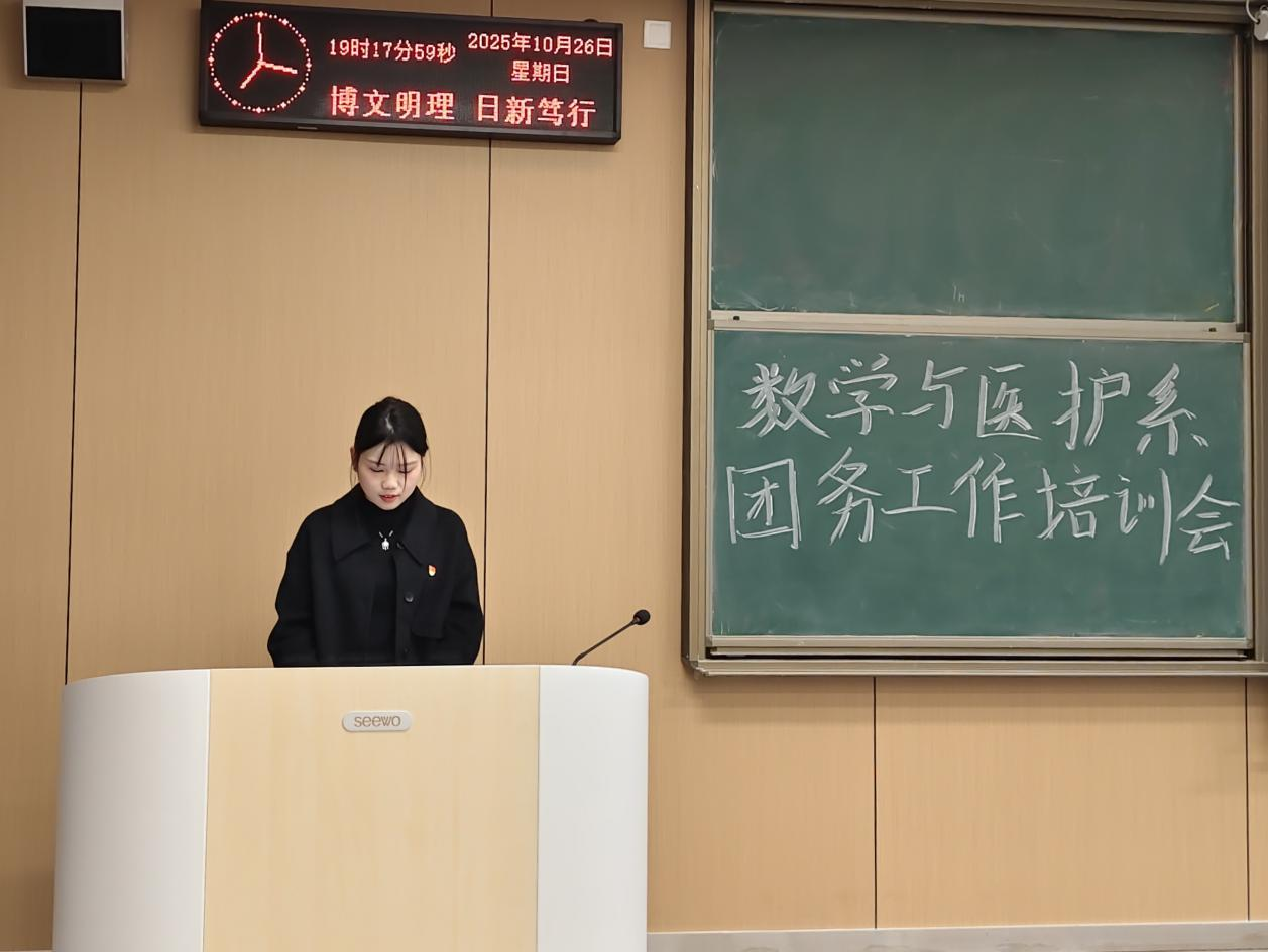 本网讯(见习记者刘金娜)为深入贯彻落实习近平总书记关于青年工作的重要思想,进一步筑牢团的基层组织根基,着力增强团支部工作的规范化水平和高效执行能力,数学与医护系于10月26日19:00在教学楼A-410教室开展团委工作培训会,本次会议由数医系员工会团总支副书记陈怡帆主持,参会人员有数医系党总支副书记燕梦蝶、优秀团支书代表阮佳莹、沈诗琴、甄若彤,2025级各班团支书及员工会组织部全体成员。