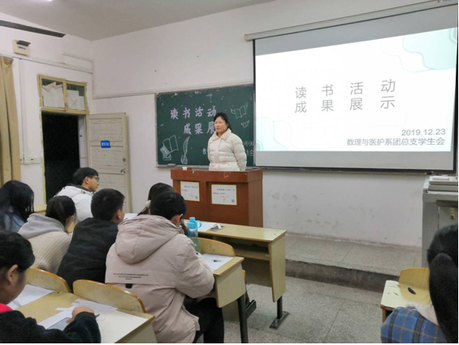 本网讯(见习记者 陆俊)12月23日晚19:00,数理与医护系在2教305教室开展“读书讲评活动”。该活动为学风建设月的子活动。