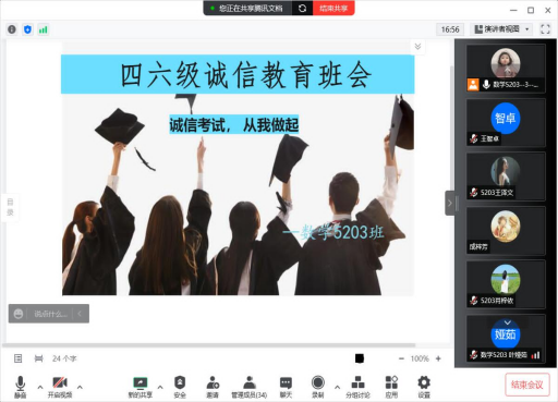 临近全国大学英语四六级考试,为了牢固树立同学们的诚信考试意识,积极响应学院学风建设号召,营造良好的考试氛围,我系2020级各班于6月3日在线召开了大学英语四六级诚信考试主题班会,班会由各班学习委员主持,班级全体同学参加。