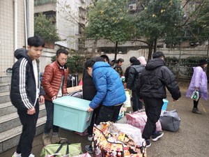 本次搬迁遇到的最大困难是天气。早上九点多,东区南苑大门口,最后一拨员工行礼尚未完全装上车,调皮的小雨就开始淅淅沥沥来捣乱。上午九点四十左右,12辆车陆续到达沙市校区基础医学院,雨雪也更加任性和放肆,一会哗啦啦一阵,一阵淅沥沥一拨,一会突然雪停雨住。为了加快搬运进度,沙市校区相关领导从药房实验室等各部门给同学们借来了推车,系部李书记康书记和沙市校区罗主任直接加入到热火朝天的搬运队伍中。直到12点所有员工行礼都搬进宿舍,雨雪依然胡闹的叫嚣。几乎所有师生被汗水和雨水反复洗礼。