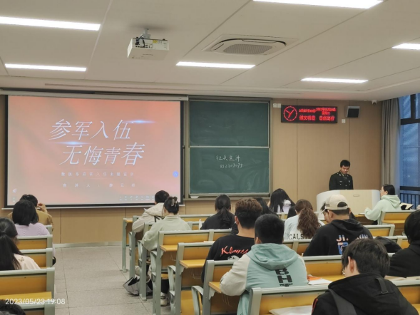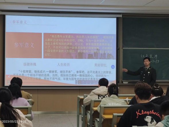 宣讲现场,宣讲人廖云峰同学作为一名老兵详细地为同学们进行了讲解,他以自身的参军经历为例向大家讲解部队生活中的苦与乐,分享部队中的点点滴滴。最后,同学们纷纷举手提问咨询相关事宜,宣讲活动在一阵掌声中结束。