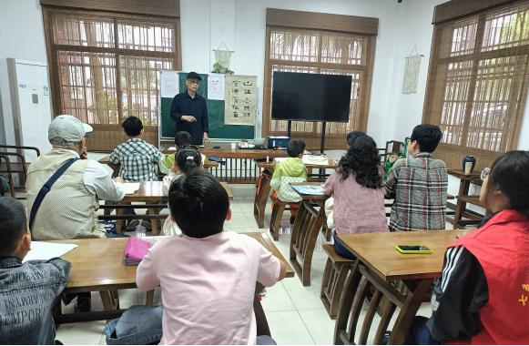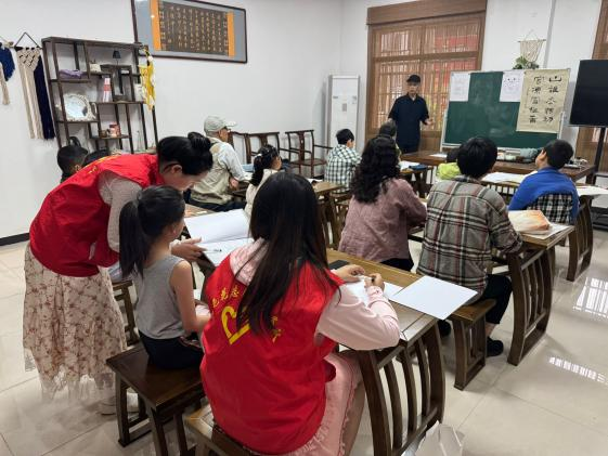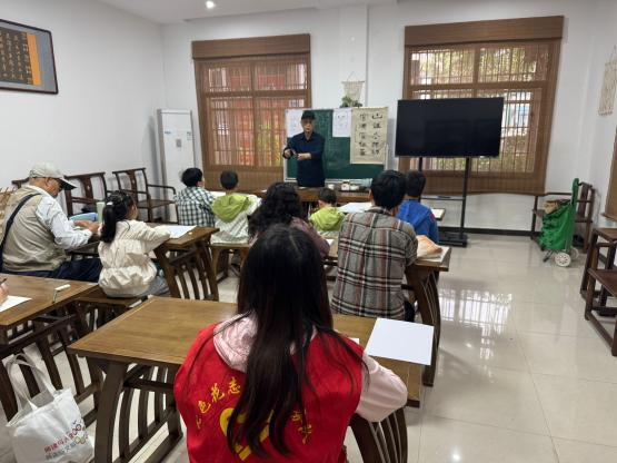 活动现场,老师首先对书画的起源发展、风格流派和笔墨纸砚的选择使用进行了介绍,让居民们对其有更深入的了解。随后,志愿者们跟随老师一起开展书画教学,细致入微地示范和指导,逐一纠正居民们的姿势,确保大家迈出正确书写的第一步。居民们全神贯注地听着,不时低头记录要点,营造了良好的学习氛围。