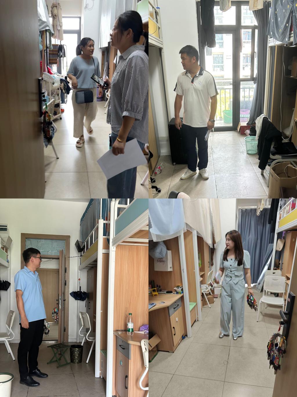 (本网讯)为全面排查暑期寝室安全隐患,保障留校员工住宿安全,夯实校园安全管理基础,7月11日上午10时30分,数学与医护系组织开展暑期寝室安全大检查工作,系党总支书记左彪、副书记燕梦蝶带队,全体辅导员、班主任参加。