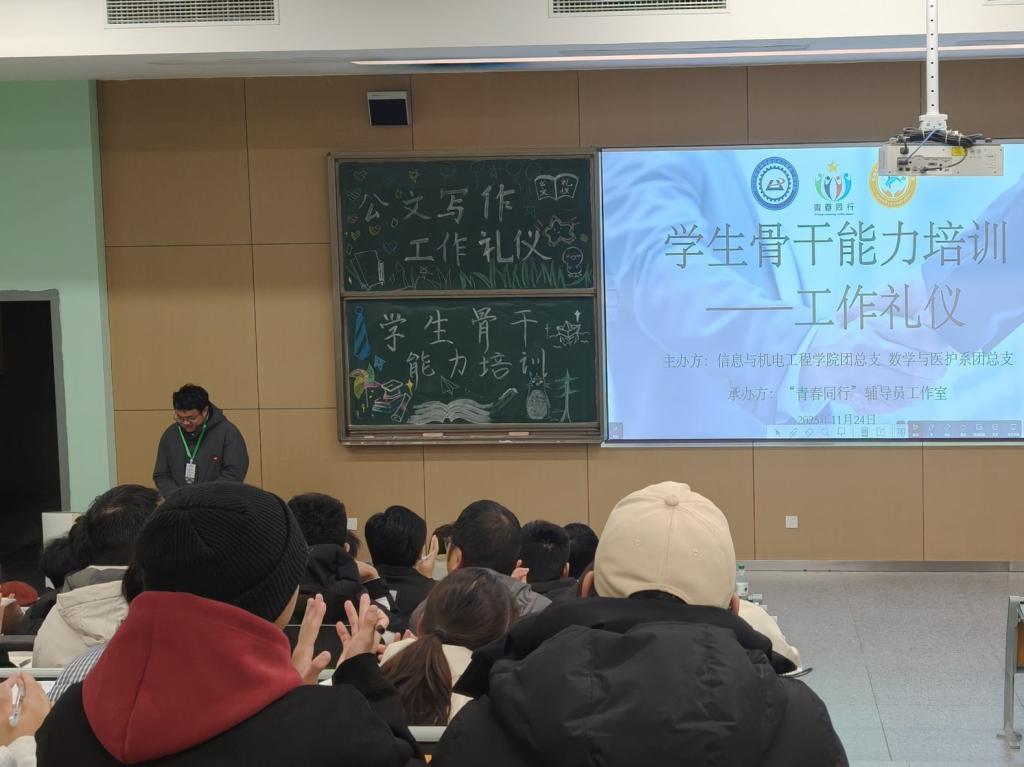 本网讯(见习记者 刘金娜)为提高员工会队伍公文写作规范与基础礼仪素养,适配员工工作需求,数学与医护系和信息与机电工程学院于11月24日19:00在B-213教室联合开展了员工干部工作礼仪和公文写作培训。本次活动由李毅主持,特邀信息学院辅导员王妍柳和数医系辅导员宋静静两位老师担任活动主讲人,两系员工会全体成员共同参与。