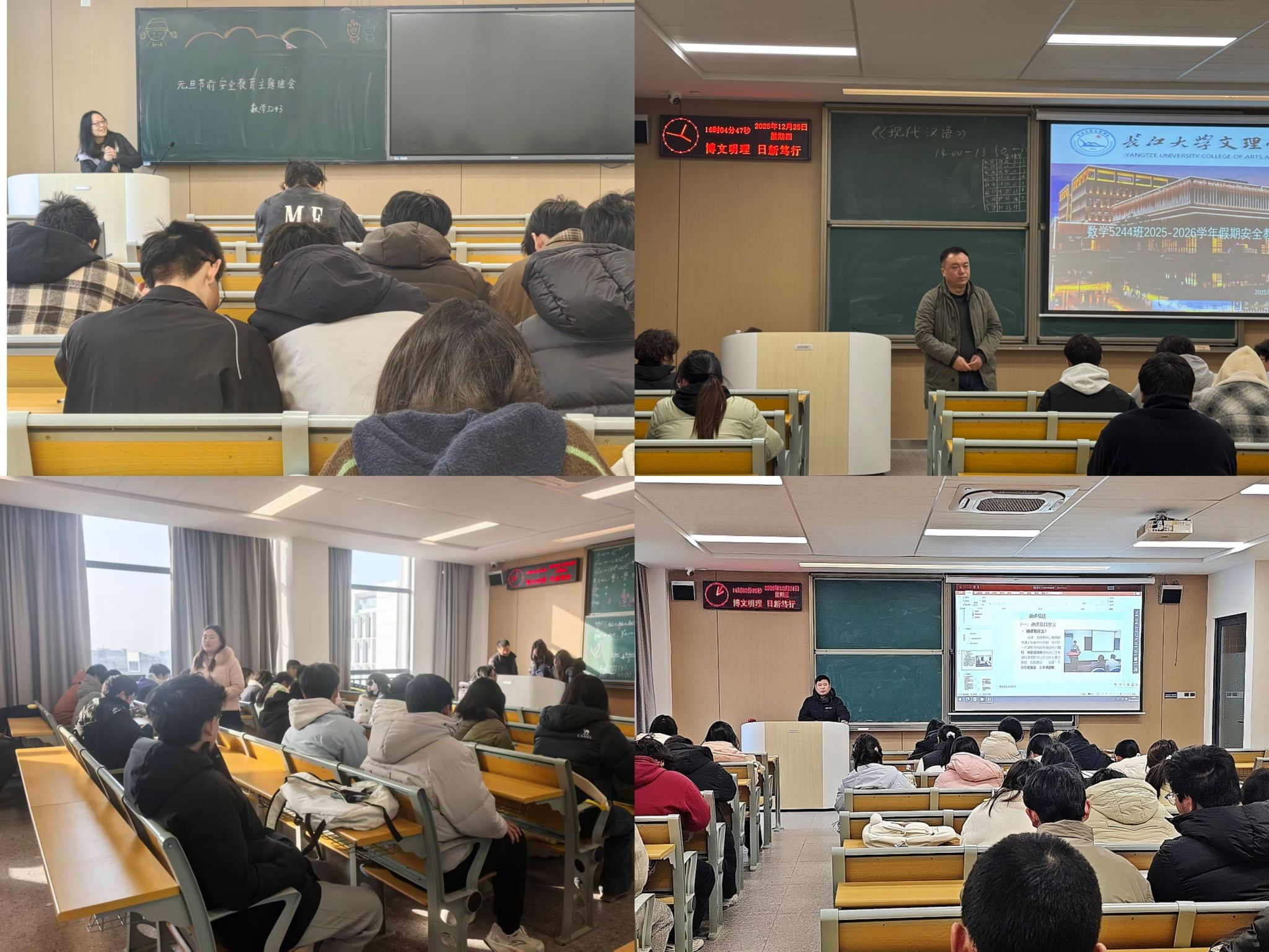 在各班级安全教育主题班会上,班主任、辅导员围绕元旦假期安全核心要点,结合近期典型安全案例,进行了全面细致的讲解。重点针对假期出行安全,提醒员工严格遵守交通规则,规避恶劣天气出行风险,谨慎选择出行方式和交通工具;聚焦消防安全,强调禁止携带易燃易爆物品 、严禁燃放或兜售烟花爆竹、规范使用电器等寝室安全准则,同时讲解火灾逃生自救常识;关注人身财产安全,警示员工警惕电信网络诈骗、防盗防骗,远离危险区域和不良场所;兼顾健康安全,引导员工合理规划假期作息,注意饮食卫生,远离各类安全隐患。此外,班会还就假期期间的应急联络机制等内容进行了强调,要求员工务必保持通讯畅通,遇突发情况第一时间向学校和家长报告。
