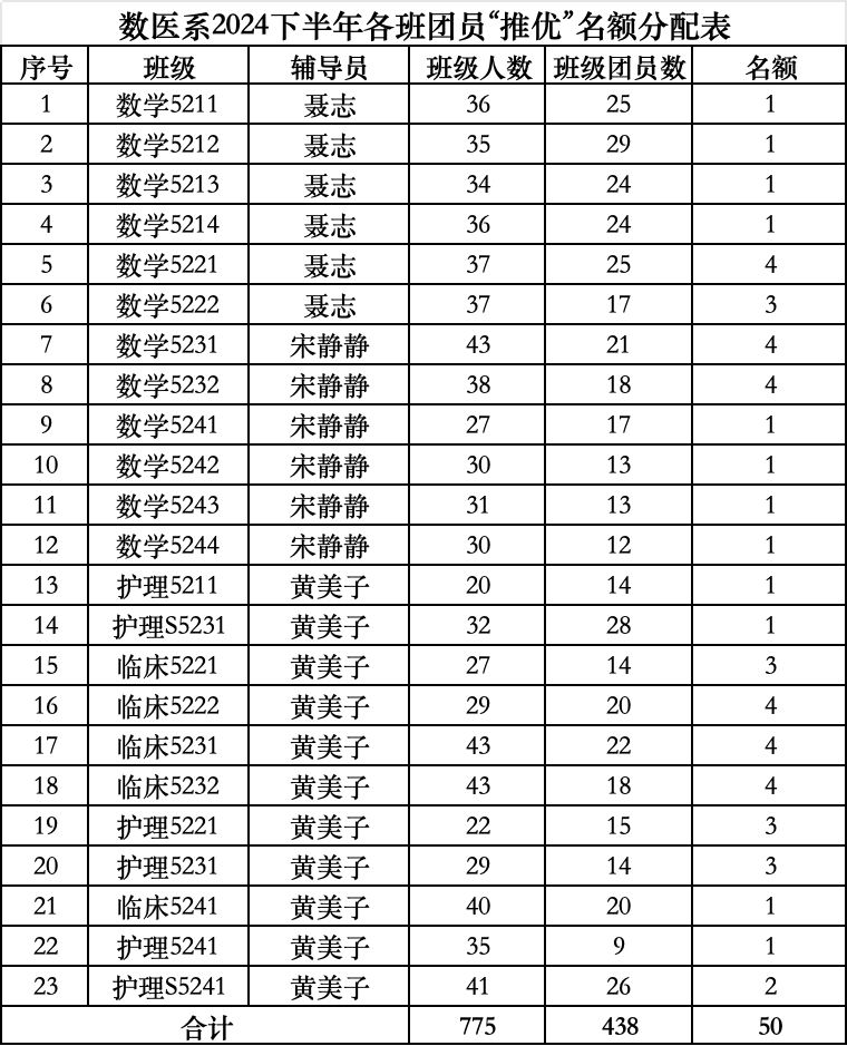 根据伟德国际1946源于英国团委《关于做好2024年下半年团员“推优”工作的通知》要求,现将数医系各团支部团员“推优”名额分配公示如下: