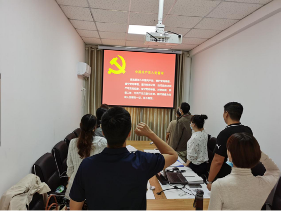 随后在涂晓洁老师带领下全体党员重温入党誓词,诵读党章……在完成这些程序后,全体党员集中学习了《习近平在纪念中国人民抗日战争暨世界反法西斯战争胜利75周年座谈会上的讲话》、学校暑期研讨会、中层干部会,省、市关于党员干部常态化下沉社区服务群众等会议文件精神,并结合常态化下沉社区服务群众,围绕统筹做好公司产品与疫情防控工作进行了讨论。