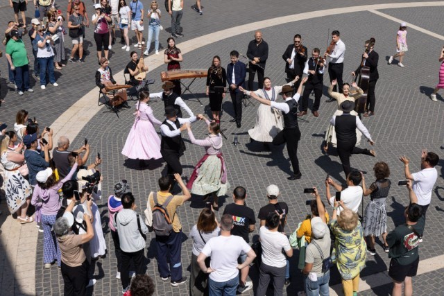 在匈牙利首都布达佩斯渔人堡,中匈艺术家在城市快闪音乐活动上表演(2025年6月14日摄)。新华社发(弗尔季·奥蒂洛摄)