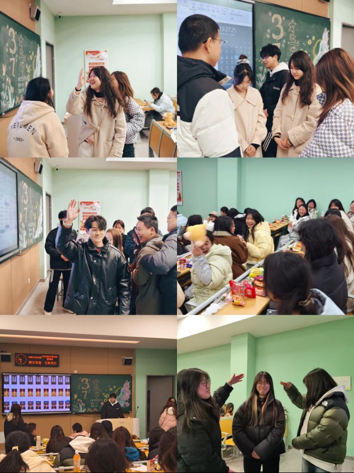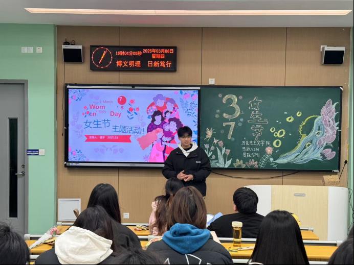本网讯(通讯员 陈冠宇)为弘扬女性力量、增进师生情谊,2025年3月6日晚,马克思主义学院于教学楼A-110S教室举办"3.7女生节"主题活动。活动由钱干同学主持,特邀学院副教授郭世德、史苗苗及辅导员李天赐出席,思政5231、5241班全体员工参加。
