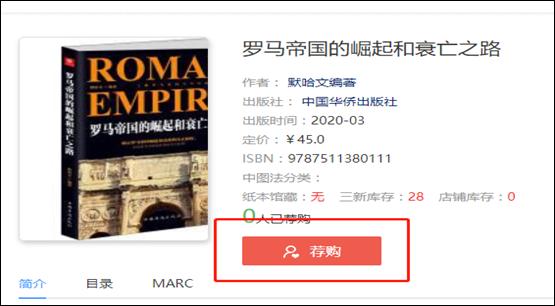 进入需荐购的图书详情页,点击荐购,可将此书荐购给图书馆。