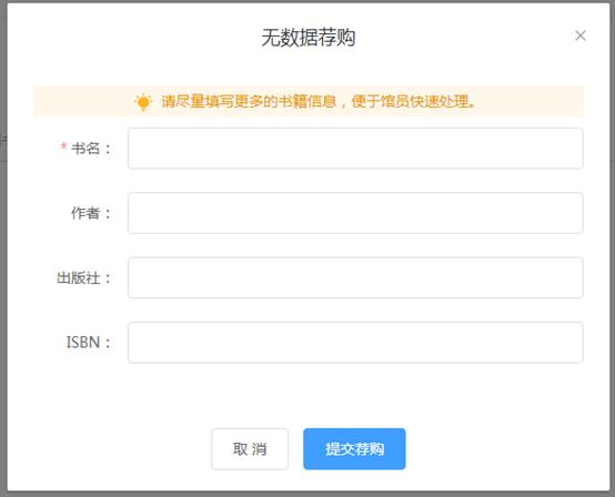 若管理员后台开启了“无数据荐购”服务,通过云田购检索找不到需要荐购的书,下方会提示“如果确实找不到也可以填写图书信息进行荐购”,可点击下方“荐购”按钮,填写书目信息提交。