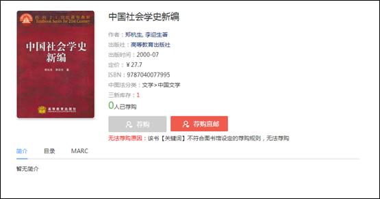 若不符合图书馆设定的规则,荐购按钮会呈灰色禁用状态,不可点击,并展示不能荐购的具体原因。