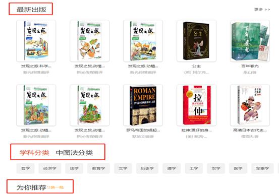 2)通过最新出版、分类浏览、为你推荐、推送书单版块,查找需要的书;