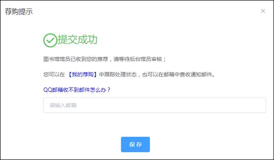 荐购成功弹框界面可输入邮箱地址,输入后保存,当荐购的书有处理状态更新时,会给该邮箱发送通知邮件。