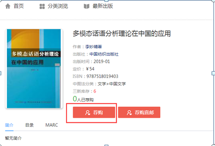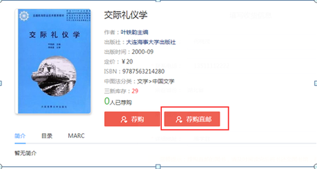 3.进入需荐购的图书详情页,点击荐购,可将此书荐购给图书馆。