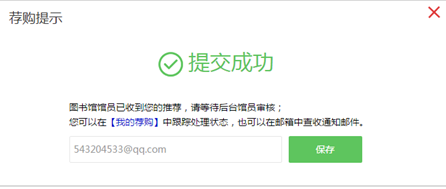 4.荐购成功弹框界面可输入邮箱地址,输入后保存,当荐购的书有处理状态更新时,会给该邮箱发送通知邮件。