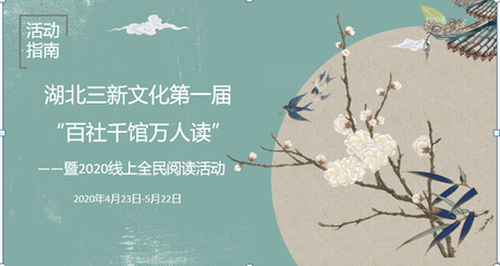 值此,湖北三新文化传媒有限公司拟于2020年4月23日(周四)——2020年5月22日(周五)举办“湖北三新文化第一届‘百社千馆万人读’——暨2020线上全民阅读活动”。