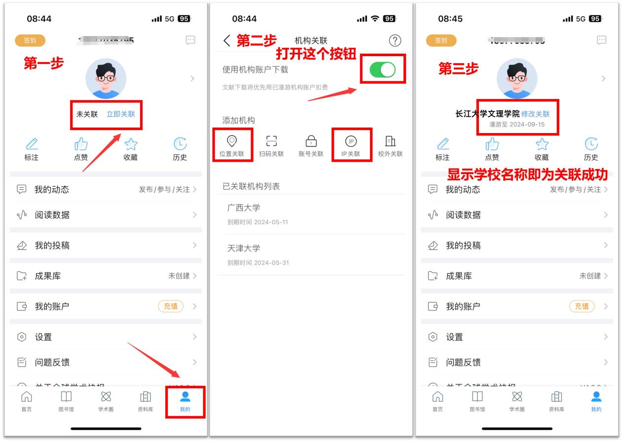 完成注册后,输入用户名和密码(或者直接微信或者qq授权登录)登录进入系统。点击头像下方的“立即关联”,打开“使用机构账户下载”按钮,可通过以下2种方法进行账号关联。
