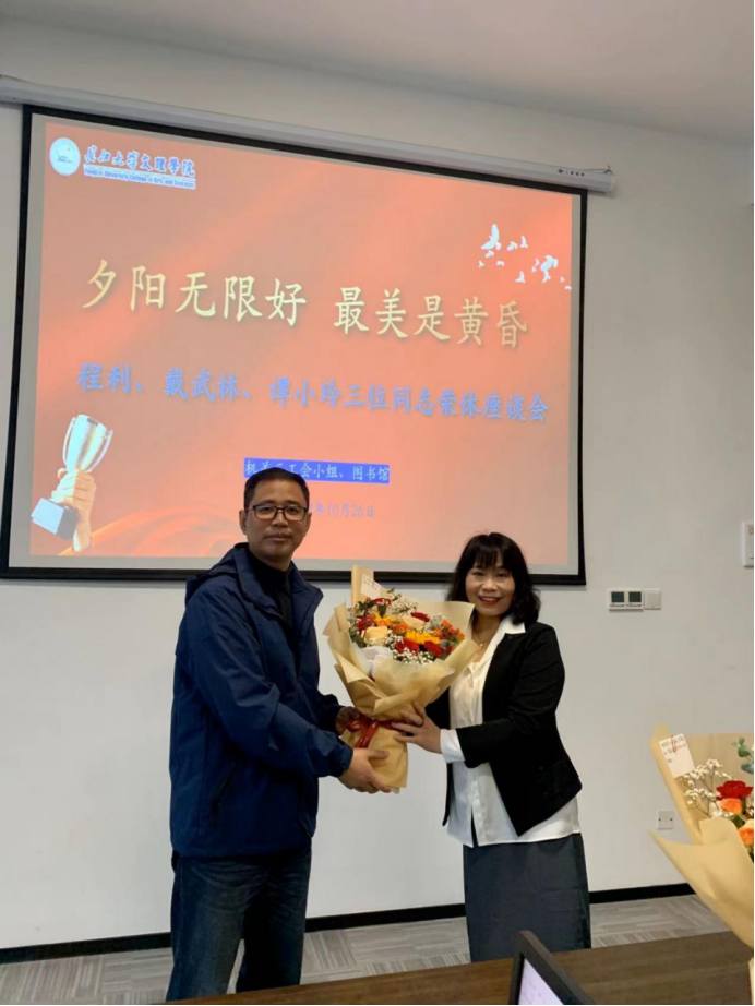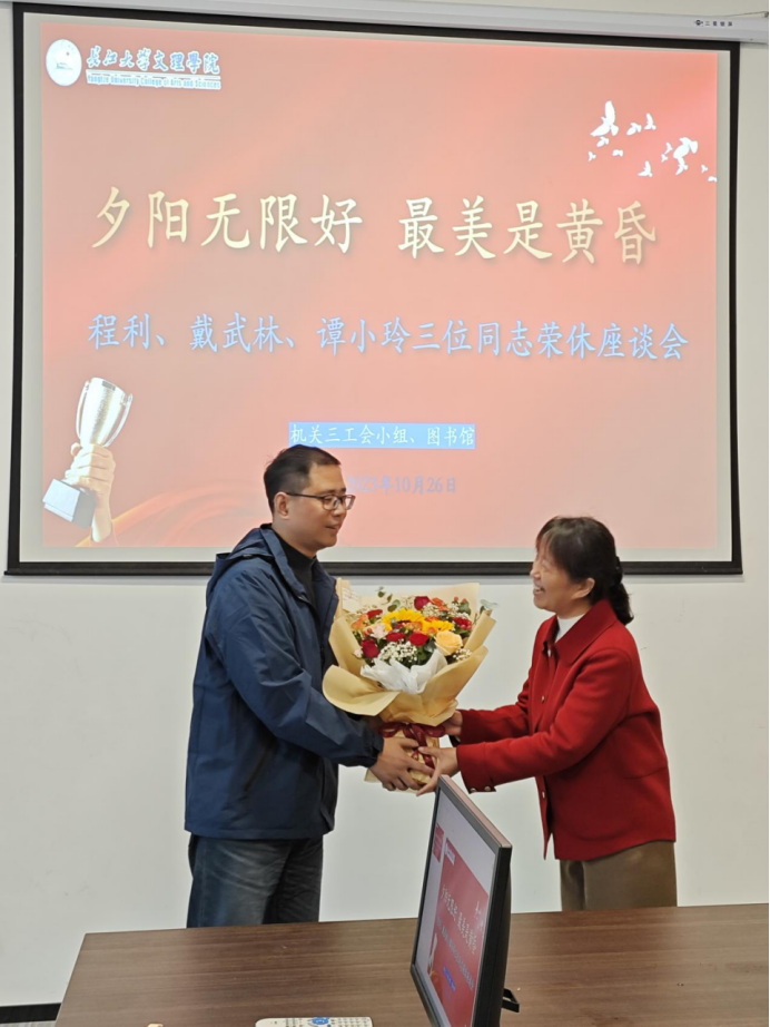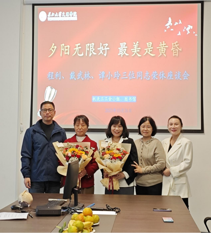 2023年10月26日上午,图书馆为程利、戴武林、谭小玲三位老师举行荣休仪式。图书馆馆长让华代表全体馆员为程利、戴武林老师赠送鲜花和祝福,图书馆全体教职员工参加活动,荣休仪式由图书馆副馆长曲莉主持。