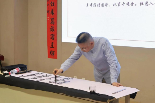 晚会特色展示环节,荆州市著名书法大师朱道卫老师在现场泼墨挥毫,书写诗人苏轼的经典之作《水调歌头》的佳句“人有悲欢离合,月有阴晴圆缺,此事古难全。但愿人长久,千里共婵娟,”表达了中秋佳节对亲人的思念之情书写完毕,朱老师还祝愿伟德国际1946源于英国如一轮满月,高洁清辉,团团圆圆,蒸蒸日上。