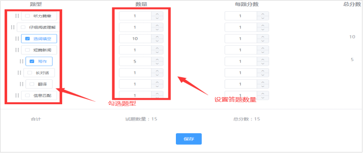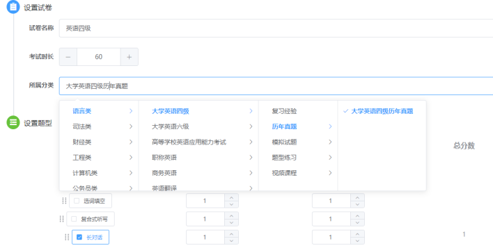 2、 对不同题型的分值进行设置